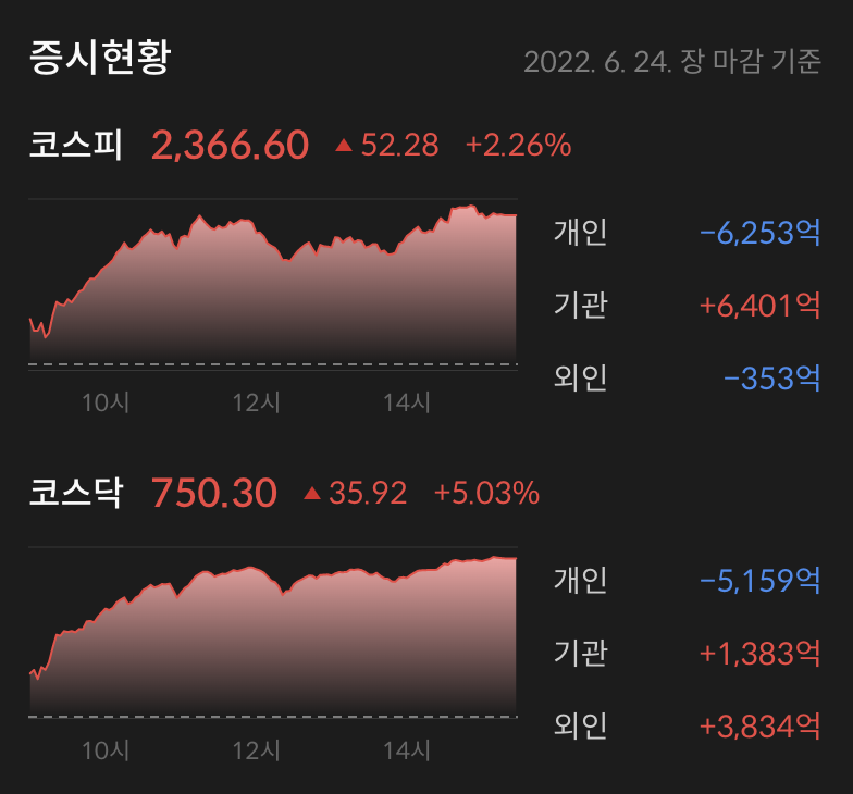 오늘 국장은 코스피 +2.26%, 코스닥 +5.03%라는 금요일 기준으로 정말 역대급으로 훈훈한 결과로 장을 마감했다.
