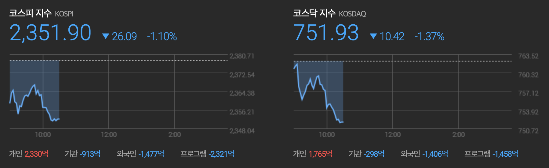 역외환율이 1300이 넘어갔었는데 역시 국장도 그냥 넘어갈 순 없다.
