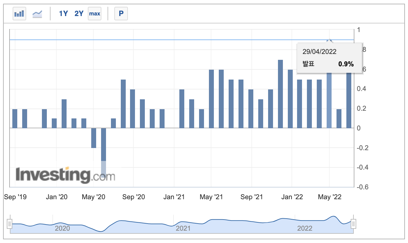 4월에 발표된 PCE는 무려 0.9%였으니 일단 단기적으로 하락 추세다라고 볼 수도 있는 셈이다.