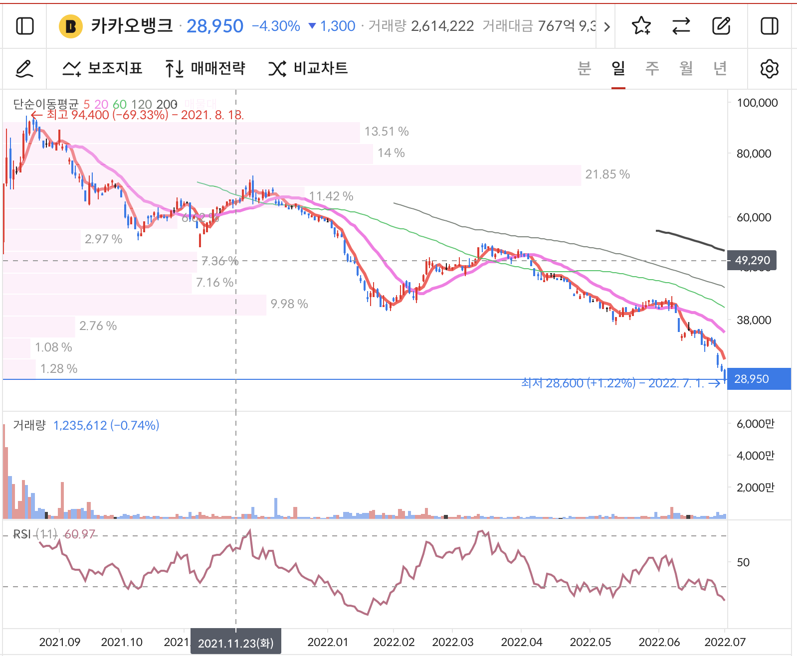 그리고 오늘 카카오뱅크의 가격은 이렇다.