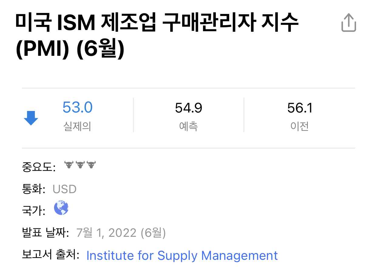 미국 ISM 제조업 PMI 6월 치가 예측치보다 낮은 53으로 지난 56.1보다 제법 많이 하향되었다.