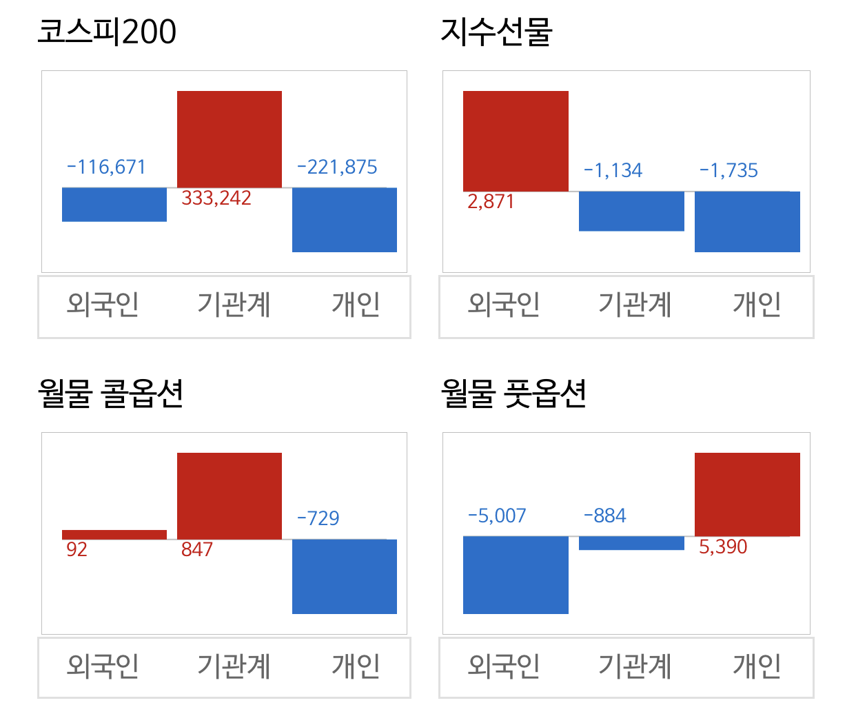 외인들이 선물을 사고 풋옵션을 팔았다. 주가 상승에 베팅하는 파생상품이다. 그런데 주가는 약보합 즉 하락했다. 무슨 의미일까?