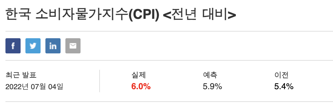 한국 전년 대비 6월 CPI가 6.0%로 발표되었다. 예측치 5.9% 보다 0.1% 높게 나왔으며, 지난달 대비 0.6%나 올라서 인플레이션이 아직도 진행 중임을 알 수 있게 되었다.