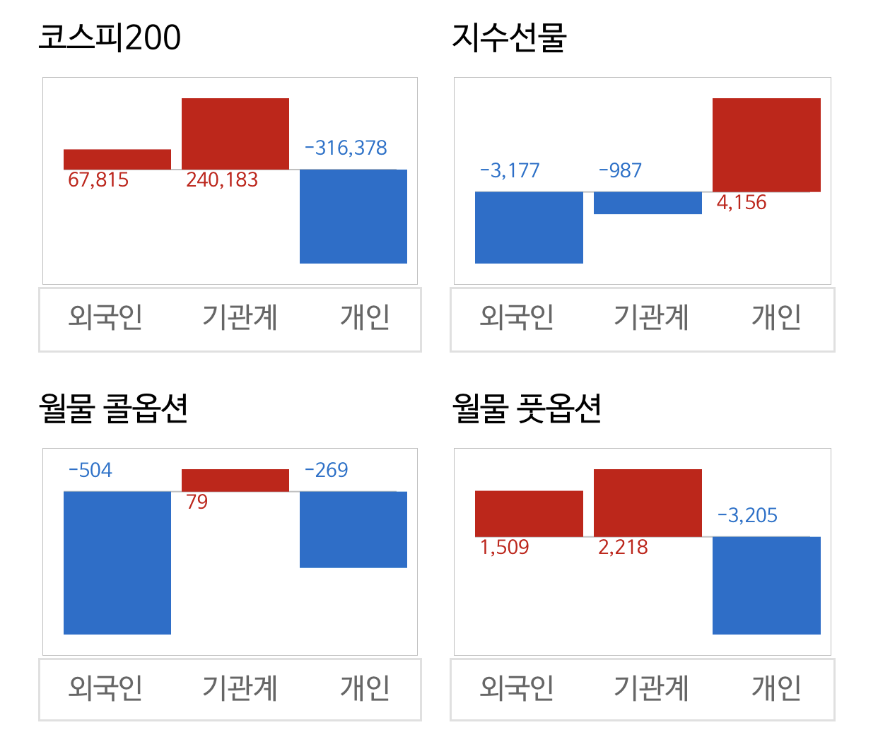 일단 외인들이 풋 옵션을 순매수하기 시작했다. 기관도 풋 매수에 가담했다. 어제와는 반대되는 모습이다. 정상적인 상승 모습인지는 아직 경험이 부족해서 잘 모르겠지만, 선물이나 콜옵션 매수가 적은 것으로 봐서 일시적 반등으로 생각하는 편이 좋을 것 같다. 그래야 대비가 가능하니 말이다.