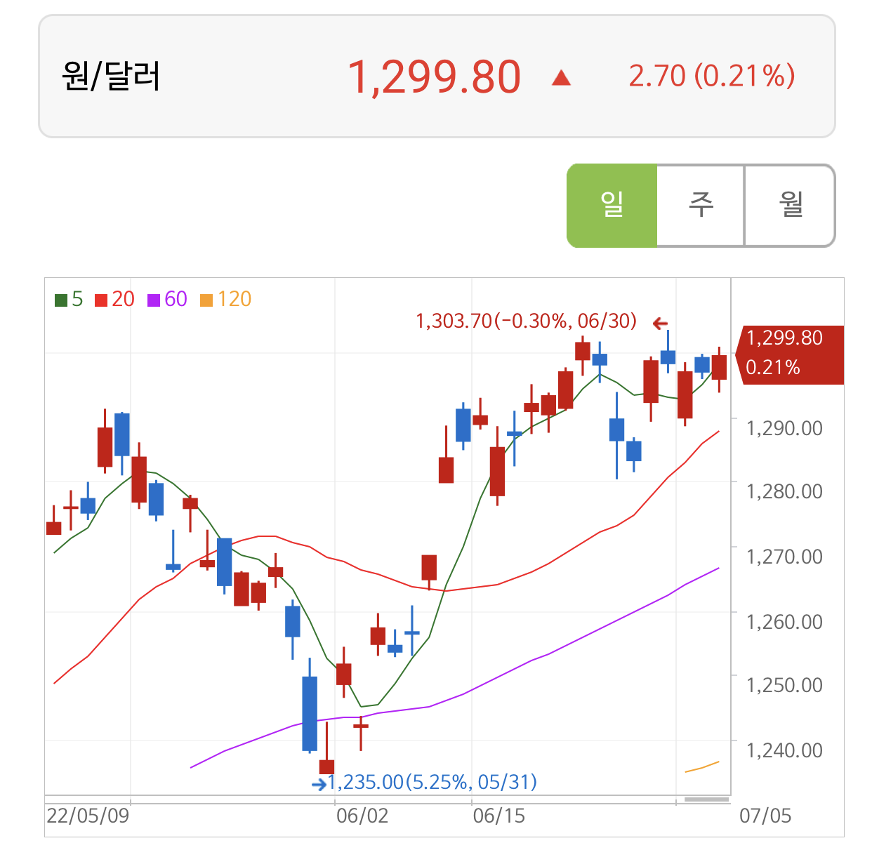 한국 외환보유고가 점점 줄어들고 있는 것으로 봐서 1300원 대를 사수하려고 뭔가 하고는 있는 것 같은데 그냥 추측일 뿐이다. 어쨌든 1300원 선은 지키고 있는 것으로 보인다. 물론 이것도 많이 비싸지만 말이다.