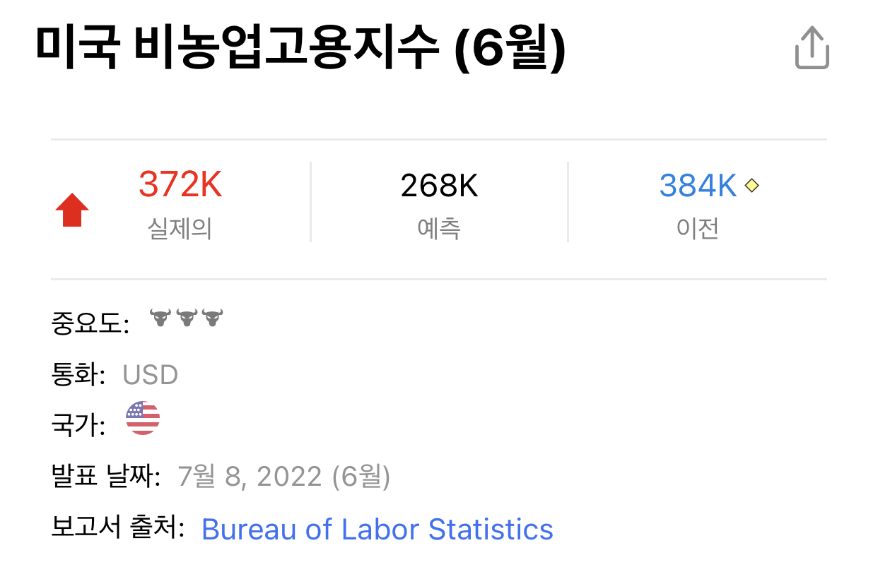 미국의 6월 비농업고용지수가 발표되었다. 예측치보다 아득히 높은 37만을 넘는 수치가 나왔다. 이전 보다도 훨씬 높은 수치다.