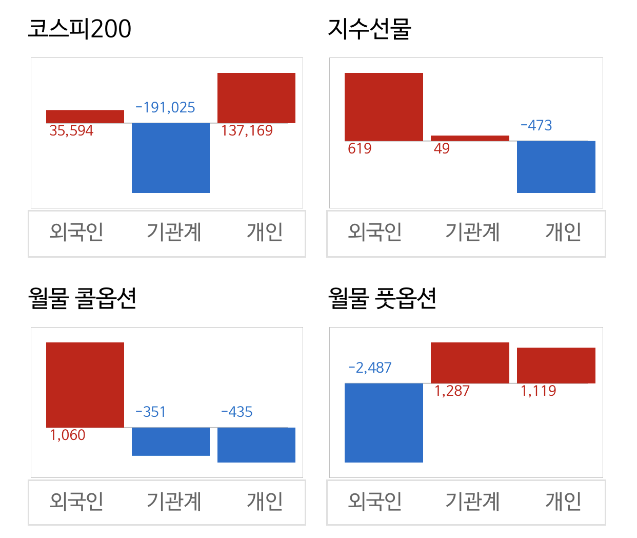 분명 장 중엔 외인들이 선물 순매도 였던 것 같은데 순매수로 바뀌었다. 뭐 어쨌든 선물과 콜옵션 순매수로 보아 외인들은 주가 상승에 베팅 중이다. 이번 주 목요일 국장은 옵션 만기일이기 때문에 뭔가 영향이 있을 것 같다. 물론 이런다고 오른다는 보장은 전혀 없다.