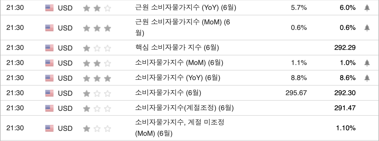 한국 시각 13일 밤 9시 30분에는 미국 CPI가 발표된다. 소문으로는 미 정부가 인플레이션이 역대급으로 굉장히 높을 것이라는 암시를 주고 있다고는 하는데 개인적으로는 소스를 찾을 수가 없어서 믿기는 힘들다. 하지만 컨센서스가 이미 8.8%로 굉장히 높게 잡혀있어서 역대급이라는 것 자체는 사실일 것 같다.