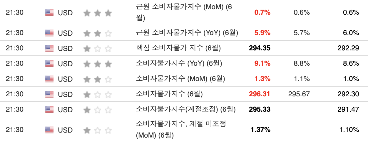 컨센서스가 이상하게 계속 높아진다 했더니 전문가들은 다들 높게 나올 것을 눈치채고 있었나 보다. 미국 6월 CPI들이 하나같이 고점을 경신해버렸다.