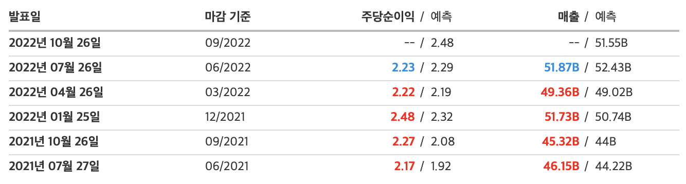 전 분기 대비 매출은 좋게 나왔다. 하지만 예측치보다 하회했다는 것이 문제다. 이미 달러 강세로 2분기 실적 악화를 예상하고 있었는데 그 예상보다 더 심한 실적이 나와버렸다. 아마도 고물가로 인한 임금 인상이 영향이 있었지 않았을까 예상되는 부분이다.