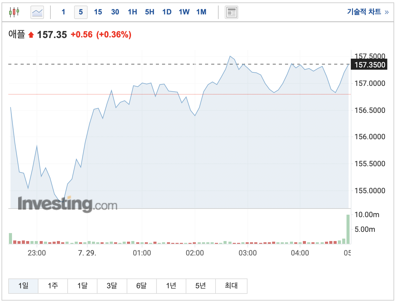 장 초반 애플의 어닝 쇼크를 예상한 투자자들이 많았는지 주가 또한 약세로 시작했었다. 그런데 이후 주가가 오른 흐름으로 보아 어닝 서프로 분위기가 옮아간 모양이다.