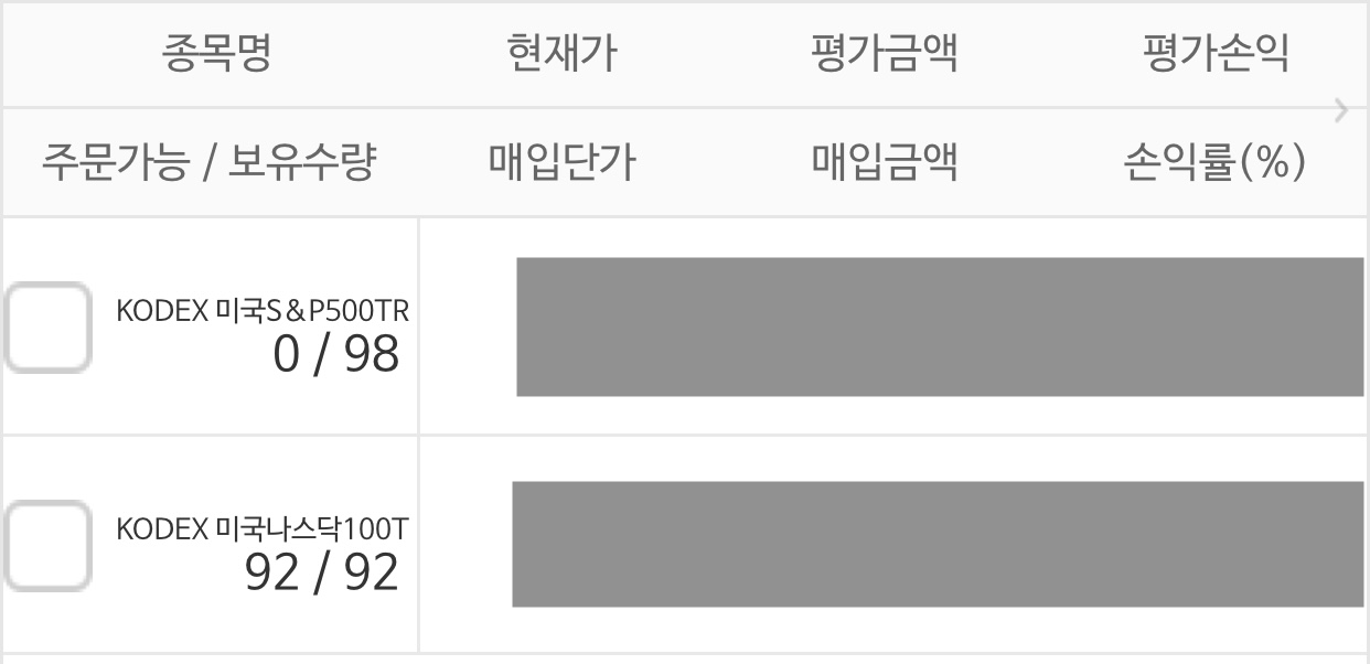위 스크린샷에서 S&P500 ETF 종목의 보유 수량이 98 임에 비해 주문 가능 수량이 0으로 표시되는 이유는 전량 매도 주문을 걸어놨기 때문이다. 반면 그 아래 나스닥 ETF는 아무 주문도 걸지 않은 상태라 주문 가능 수량과 보유 수량이 동일하다.